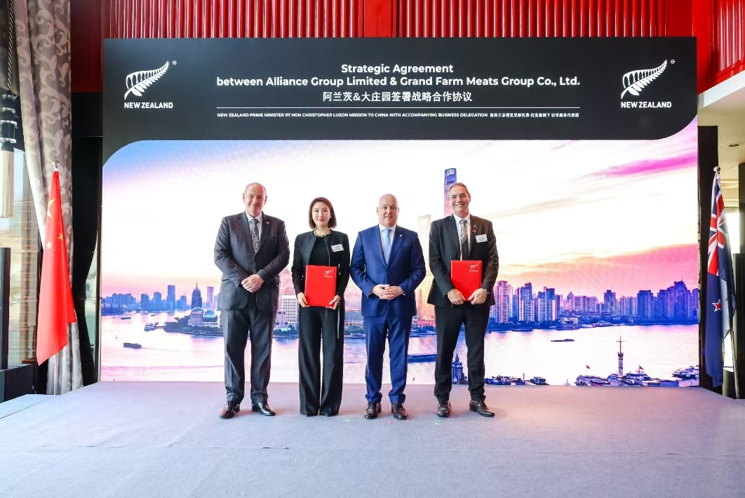 6月18日傍晚,“新中商業合作發布會”在上海半島酒店隆重舉行。在新西蘭總理拉克森與駐華大使喬文博的見證下,新西蘭企業與眾多中國合作伙伴簽訂不同等級的合作協議。大莊園集團作為中國牛羊肉行業領軍企業,與阿蘭茨集團再次簽訂戰略合作協議。值得驕傲的是,大莊園是當晚簽約企業中僅有的兩家肉類企業之一。